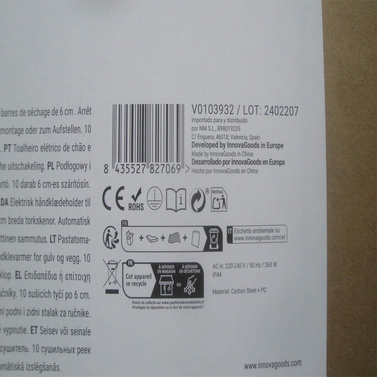This free standing or wall mounted electric towel rail allows you to dry towels quickly and conveniently. It is also very useful for warming towels in winter. Includes wall mounting accessories. IP44. Timer: 2-4 hr. Temperature: 55 ºC max. Power: 260 W.