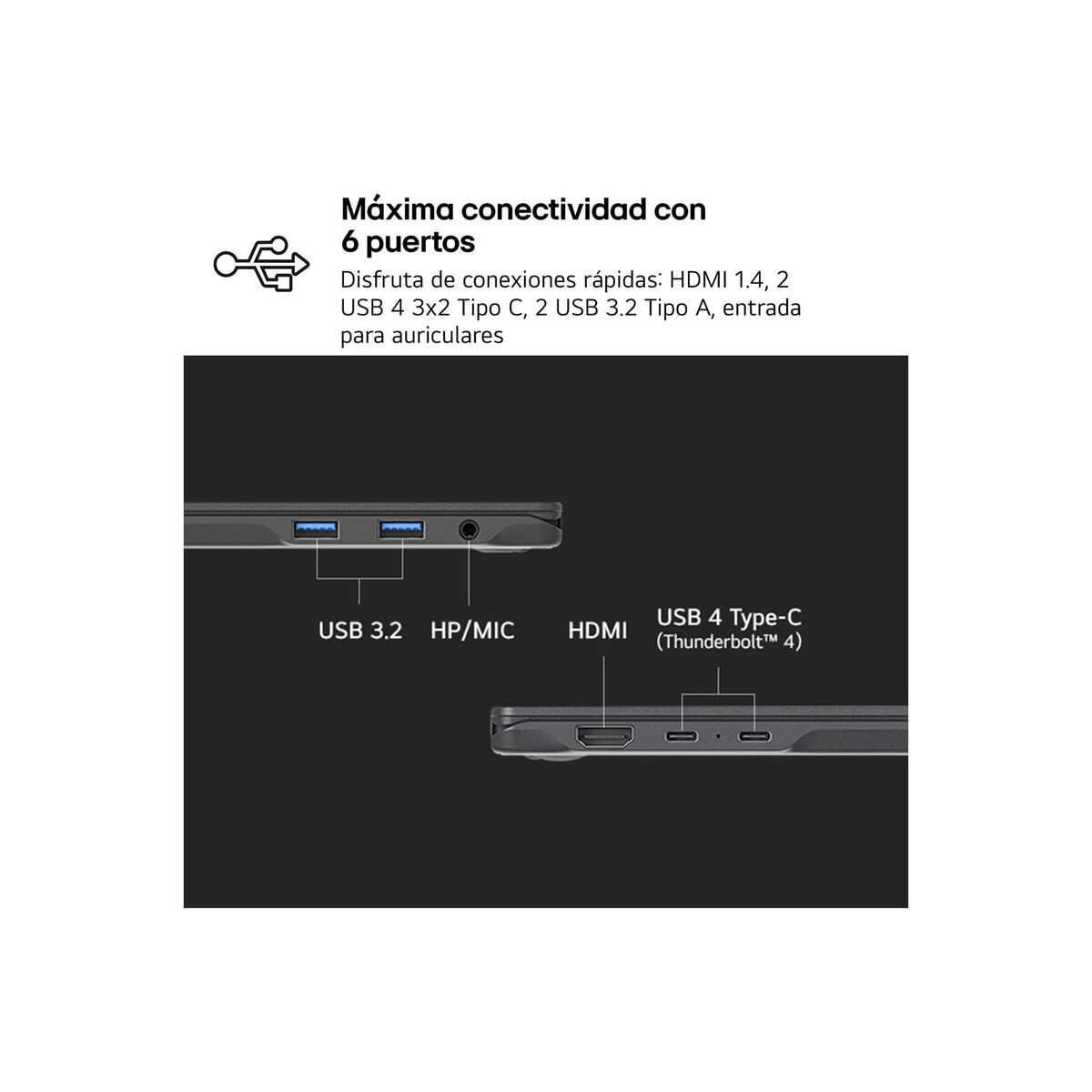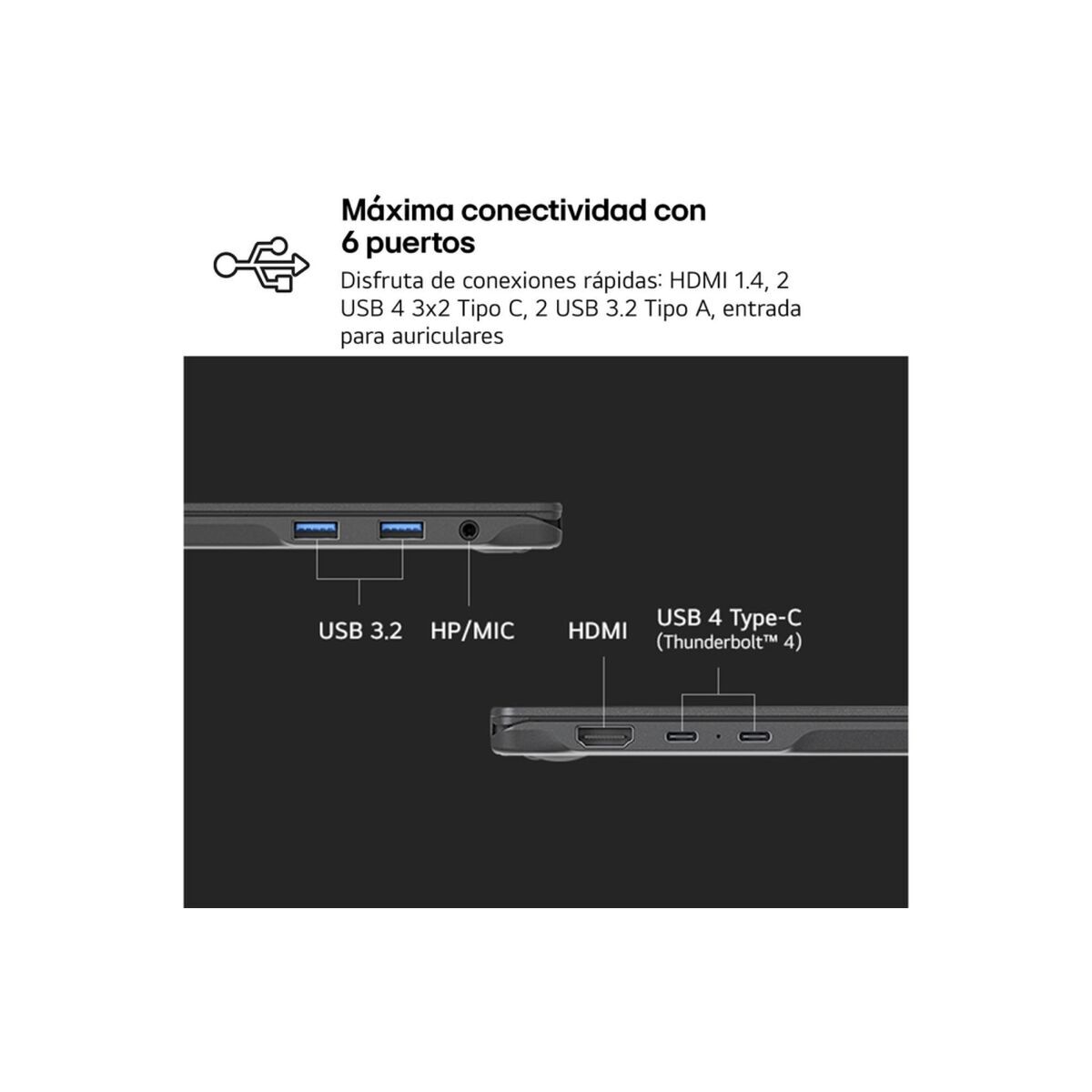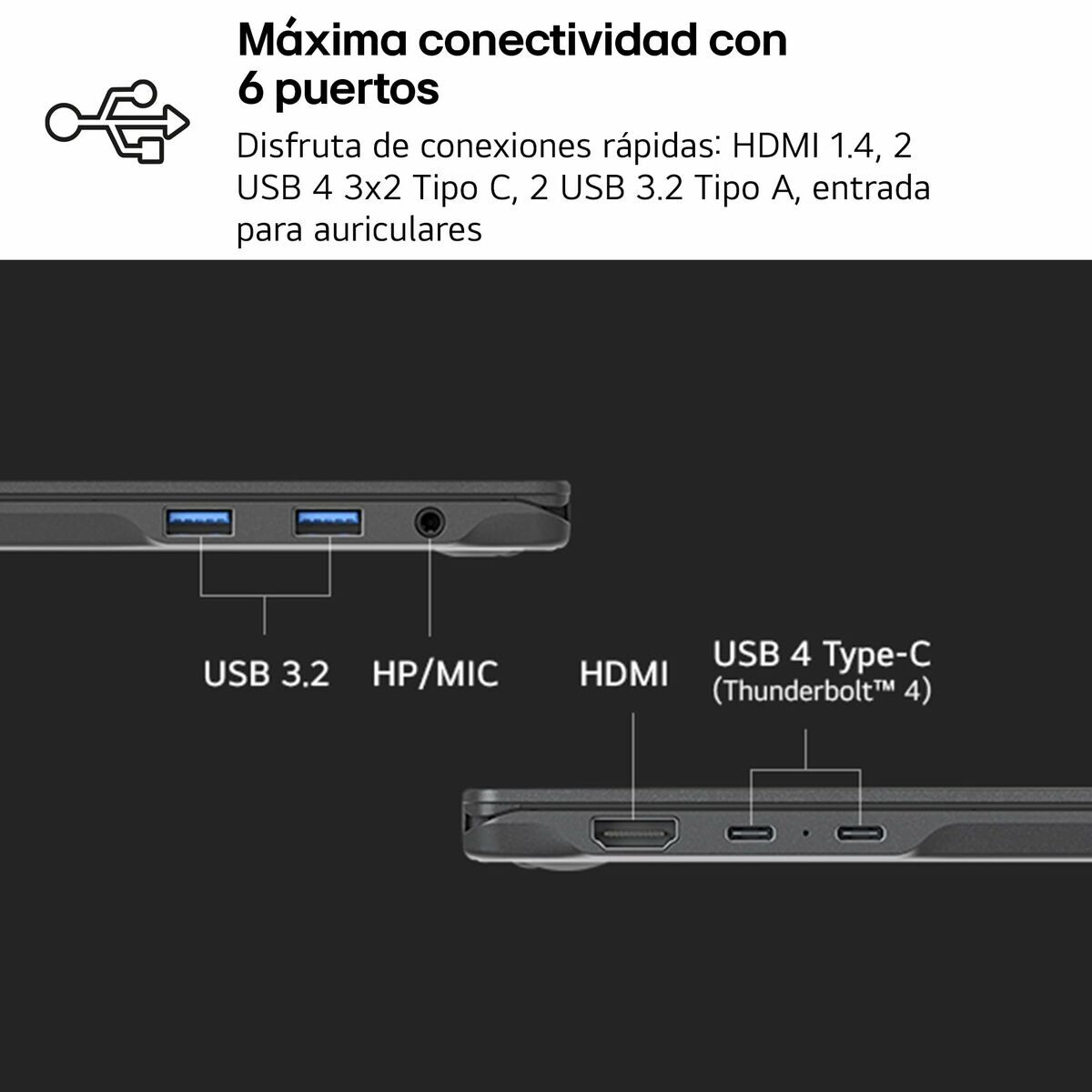 The LG 14Z90RU-G.AA55B laptop is a portable device designed to offer a balance between portability, performance, and durability, ideal for professionals and students who need mobility without sacrificing power. Its 14-inch screen with WUXGA resolution (1920 x 1200) and IPS technology delivers sharp images with vivid colors thanks to a wide 99% DCI-P3 color coverage and a 16:10 aspect ratio that allows more content to be viewed with less scrolling, optimizing both work and entertainment experiences. It features a 13th generation Intel Core i5 processor (model 1334U) with 12 MB cache, which together with the integrated Intel Iris Xe Graphics ensures efficient performance for demanding tasks, including video editing and multitasking applications. It includes 16 GB of LPDDR5 RAM, providing fast data handling and smooth performance, and a 512 GB SSD that guarantees adequate capacity and quick access times to files and programs. This laptop stands out for its lightweight and durable design, made with materials that have passed seven-level military resistance tests, offering robustness without compromising lightness, facilitating daily transport. Battery life is another strong point, with a high-capacity 72 Wh battery that extends usage up to 24.5 hours, allowing full workdays without recharging. Its keyboard is QWERTY in Spanish, adapted for comfortable and precise typing. For connectivity, it includes several ports, including 2 Thunderbolt™ 4 for maximum scalability and fast data transfer, plus Wi-Fi and an integrated webcam for video calls. The sound experience is enhanced with Dolby Atmos, offering immersive audio improved by smart amp technology, essential for multimedia consumption and clear videoconferences. It also features an advanced attention sensor system that detects face, eyes, and gaze to improve security and accessibility. This device runs on Windows 11 Home 64-bit, providing access to the latest operating system generation with support for the newest tools. Overall, the LG 14Z90RU-G.AA55B is a sophisticated portable solution combining efficiency, durability, and autonomy, suitable for those seeking a versatile, compact laptop with advanced technology for daily work and entertainment.