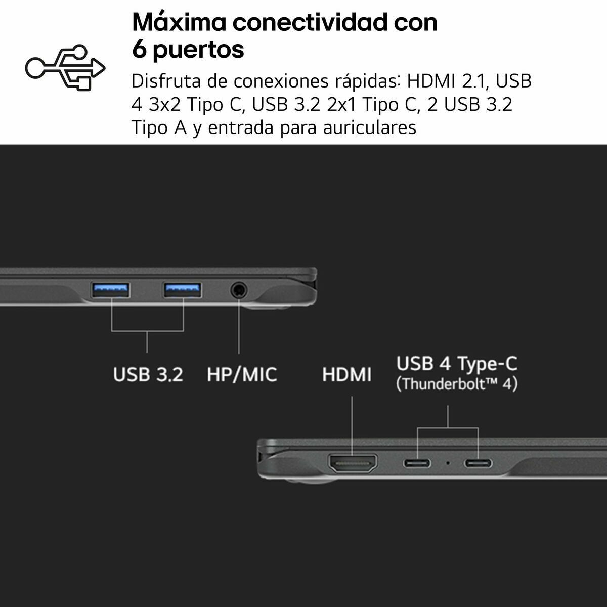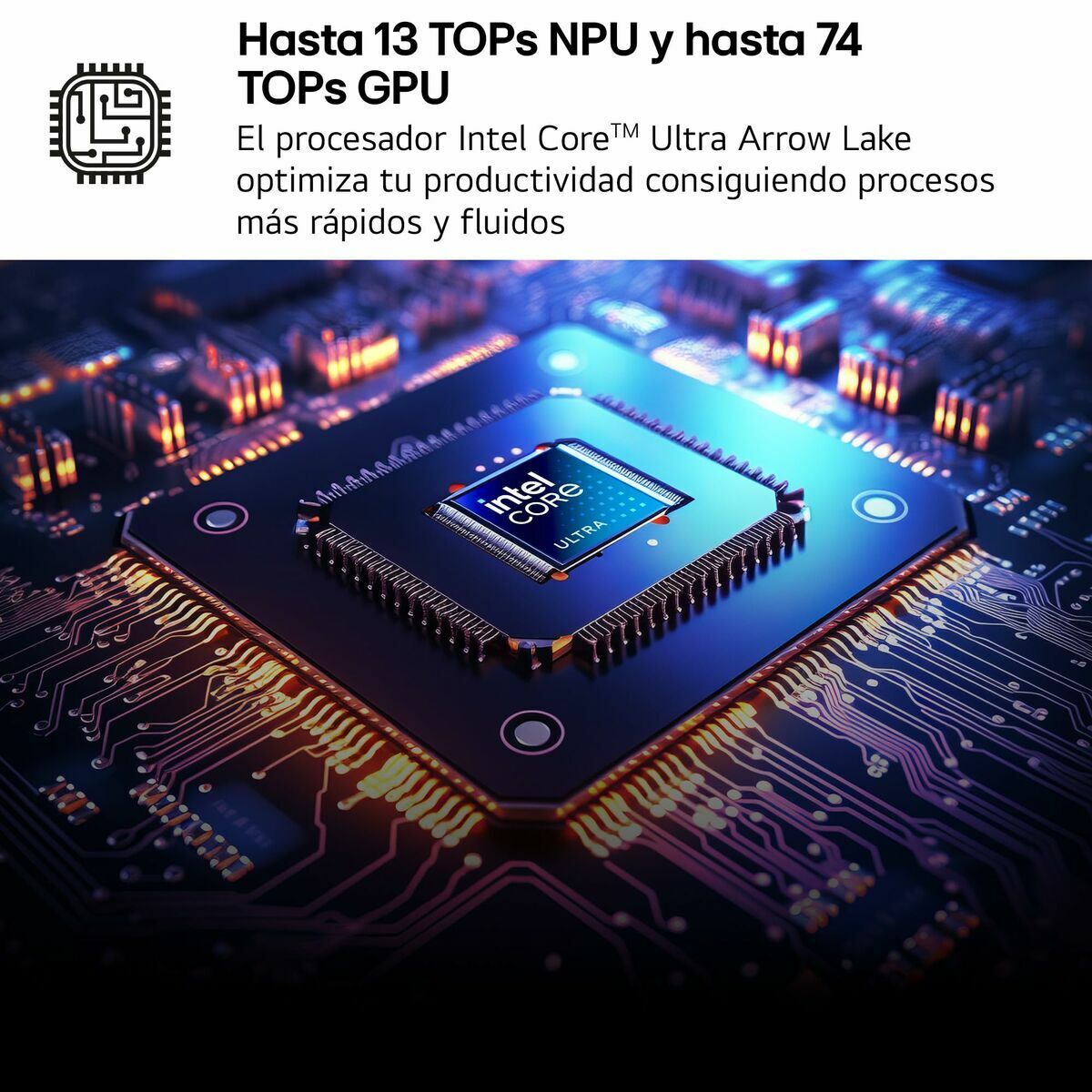 The LG 16Z90T-G.AD88B is an ultralight laptop designed to deliver advanced computing through a blend of power, portability, and functionality. It features an Intel Core Ultra 7 255H processor, ideal for demanding users who need smooth performance for professional tasks, creative applications, or intensive multitasking, paired with 32 GB RAM for outstanding multitasking across multiple programs and processes. Its 1 TB SSD storage ensures high capacity and much faster data access than traditional drives, enabling instant file and app loading. The 16-inch display with advanced resolution provides ample workspace and sharp visuals in any environment, while the Intel Arc 140 graphics card delivers efficient support for multimedia editing, design, and high-definition content playback. The device includes a Spanish QWERTY backlit keyboard with numeric keypad for productivity, plus an integrated front camera for clear, secure video calls. Connectivity options include modern Wi-Fi 7, HDMI, and card reader, making it easy to connect with current and future peripherals. Finished in elegant black, the laptop comes with Windows 11 Home, providing instant access to the latest Microsoft tools and optimal compatibility with professional and entertainment software. This model does not include an optical drive or touchscreen, prioritizing a lighter, slimmer design for those who value mobility without sacrificing technical features. The LG 16Z90T-G.AD88B is aimed at users seeking efficiency, large storage, and up-to-date technology in a robust, stylish portable device.