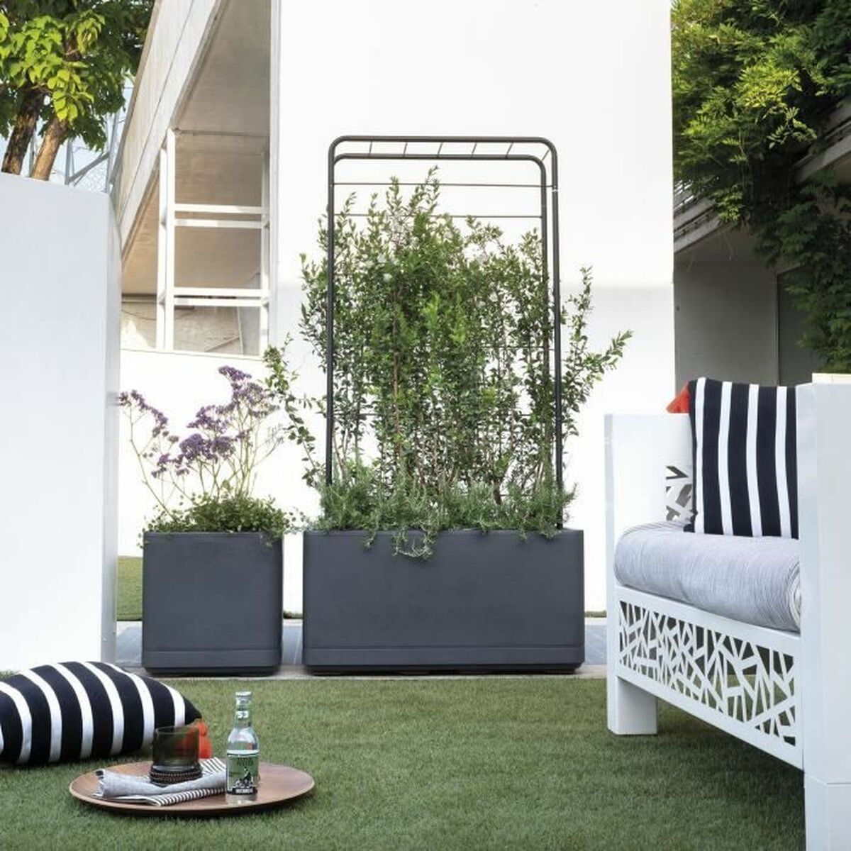 The Deroma Cosmo Cube planter is a practical and functional solution for gardening both indoors and outdoors, designed in a contemporary style with finishes in anthracite and white that easily adapt to different settings. Made from high-durability recycled plastic, this planter supports environmental sustainability without sacrificing strength or aesthetics. It measures approximately 38 x 38 x 39 cm, a versatile size that accommodates a wide variety of plants, from small shrubs to decorative flowers. Thanks to its cube shape, it offers good stability and adequate volume for proper root development. One of its key features is the inclusion of an integrated water reservoir, which simplifies watering and helps maintain optimal moisture levels in the substrate, extending intervals between watering and promoting plant health. Additionally, the planter has built-in wheels, allowing easy movement without effort—ideal for rearranging spaces or moving heavy plants without damaging the container or floor. Its lightweight yet sturdy material makes it suitable for both domestic and professional use, combining functionality with a sleek, modern design. The robustness of the recycled plastic ensures good resistance to weather conditions and sun exposure, guaranteeing a long service life. Overall, this planter offers a balance of sustainability, convenience, and contemporary design, making it a recommended choice for those seeking a versatile and reliable gardening product.
