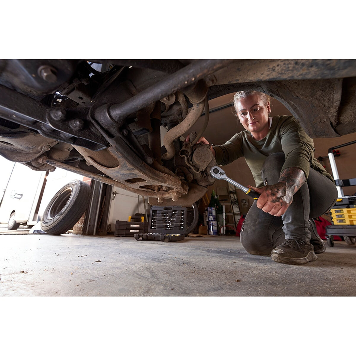 The FMMT82826-1 by Stanley is a wrench set designed to offer versatility and durability for both professional workshops and demanding home users. This set, made from high-quality steel with a grey finish, is manufactured in Taiwan and includes a total of 38 pieces that cover the most common needs for mechanical, repair, and assembly work. Its wrenches and accessories are crafted entirely from metal, ensuring resistance to wear and a long service life under intensive use. Each component features precise fitting, making work in tight spaces easier and ensuring optimal torque application. It includes various sizes and types of wrenches, adapting to a wide range of screws and nuts, making this set a comprehensive solution for both occasional interventions and regular maintenance tasks. The set comes in a compact, sturdy case with metal latches, helping keep tools organized and protected during transport or storage. These features make the Stanley FMMT82826-1 a reliable, practical, and highly regarded choice for those seeking a professional set of effective, durable, and well-organized wrenches for everyday use.