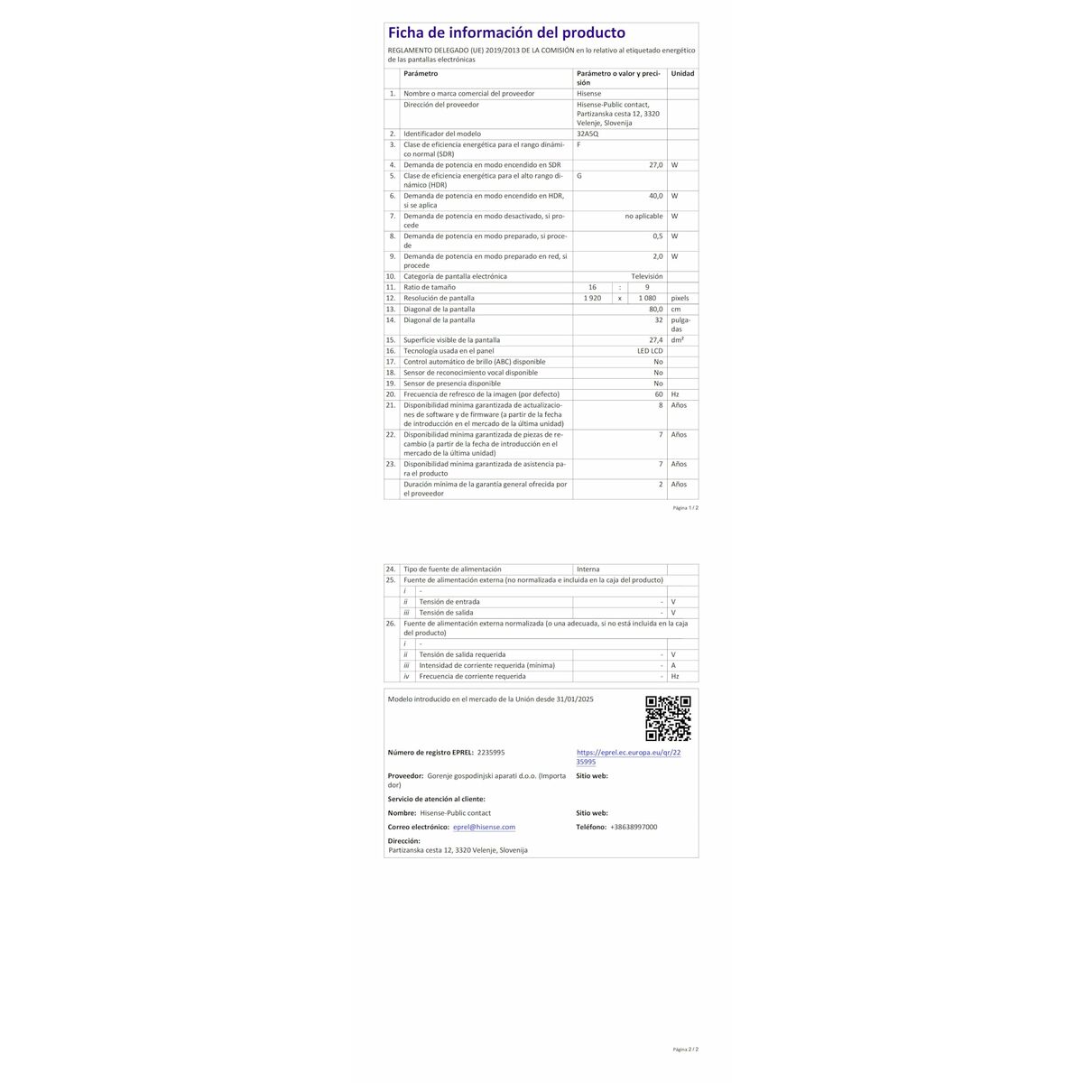 The Hisense 32A5Q is a 32″ Smart TV designed to deliver a balanced visual and audio experience in small to medium spaces. Equipped with a 32-inch QLED screen with Full HD 1920 x 1080 resolution, it provides sharp images and vivid colors thanks to advanced panel technology that enhances brightness and saturation, ideal for multimedia content and high-definition broadcasts. This TV features an integrated sound system with an estimated power of 16W RMS that ensures clear audio, complemented by noise reduction and equalizer technologies to improve sound quality across different content types. It also includes Wi-Fi connectivity to access Smart TV apps and services through its VIDAA operating system, offering an intuitive and fast interface for streaming and browsing. It stands out for its versatility in signal reception, supporting both digital and analog tuners, including the latest standards such as DVB-C, DVB-S, DVB-S2, DVB-T, and DVB-T2, facilitating access to a wide range of channels and content in various formats. Its black design and flat screen with a 16:9 aspect ratio easily fit into any environment, while the presence of USB 2.0 ports allows connection of external devices for media playback or updates. Overall, this model combines suitable features for home entertainment with image and sound quality tailored to users seeking an affordable and complete smart TV for traditional TV viewing and digital platform access. The Hisense 32A5Q represents a practical and functional option within the 32-inch TV range focused on versatility and connectivity.
