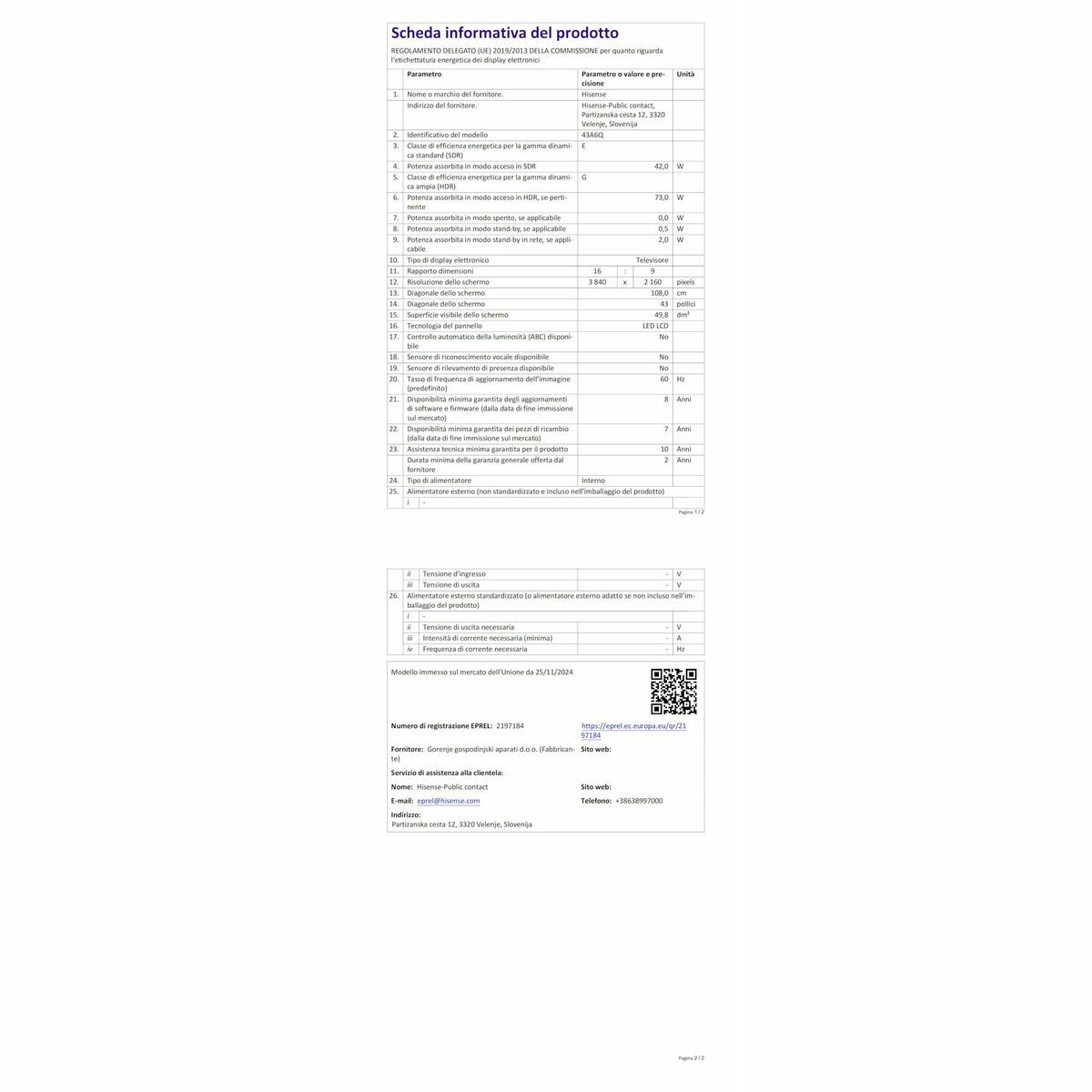 The Smart TV 43″ Hisense 43A6Q is a versatile solution offering an advanced audiovisual experience in a compact format, ideal for living rooms, bedrooms, or multipurpose spaces. It features a 43-inch screen in elegant black, delivering highly realistic images thanks to its 4K Ultra HD resolution, where every detail comes to life with clarity and vibrant colors. The Smart TV platform powered by VIDAA allows intuitive access to streaming apps, web browsing, on-demand services, and interactive content, greatly expanding entertainment options. It integrates advanced picture technologies such as Dolby Vision, optimizing contrast and tonal depth for a more immersive experience, and Game Mode Plus, designed to provide low latency and smoothness during gaming sessions—ideal for enthusiasts who value quick on-screen response. The sound system includes DTS Virtual:X, delivering surround effects and enhanced audio presence without the need for extra equipment, for a more complete home cinema feel. Voice control makes it easy to manage the TV and search for content using simple commands, improving accessibility and user convenience. Its multi-dynamic digital tuner supports DVB-C, DVB-S, DVB-S2, DVB-T, and DVB-T2, ensuring compatibility with most European broadcasts, and offers additional features such as electronic program guide (EPG), teletext, and audio equalizer to personalize the experience for each user. With its energy rating E, this model balances performance and consumption, making it a functional and modern choice for those seeking image quality, connectivity, and ease of use in the smart TV segment.