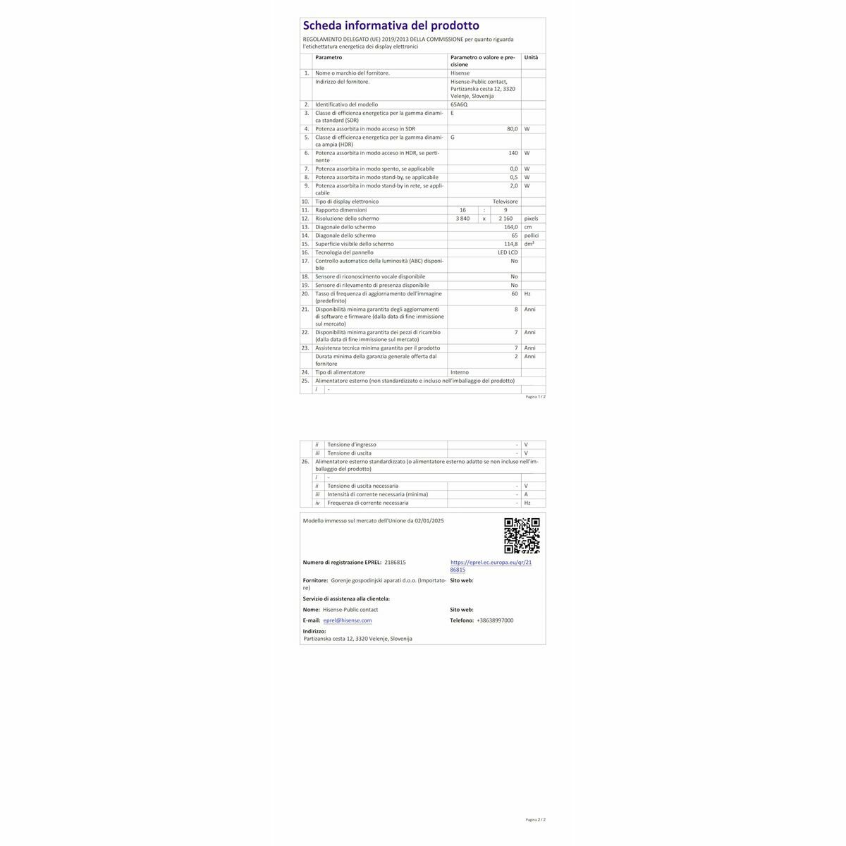 The Hisense 65A6Q is a 65-inch Smart TV that delivers an advanced visual experience thanks to its 4K Ultra HD resolution (3840 x 2160 pixels), providing sharp and vibrant images on a flat LED screen. This TV stands out for its efficient energy rating E, contributing to moderate electricity consumption without sacrificing performance. Equipped with the VIDAA U8.5 operating system, it allows smooth navigation and access to smart apps and features, making it a versatile and accessible multimedia hub. Built-in WiFi connectivity facilitates wireless access to online content and streaming. For audio, it offers an estimated 20W RMS power, providing suitable sound for everyday living room use. Its black design fits any setting, adding a discreet and modern touch. Regarding signal reception, this model integrates a digital tuning system compatible with multiple formats: DVB-C, DVB-S, DVB-S2, DVB-T, and DVB-T2, ensuring compatibility with most terrestrial, cable, and satellite digital TV signals. Additional features include a sound equalizer to enhance audio experience, teletext, electronic program guide (EPG), and web browsing, expanding entertainment options. Overall, the Hisense 65A6Q is a solid choice for those seeking a large 4K TV with smart features, combining current technology and functionalities for a connected and complete television experience.