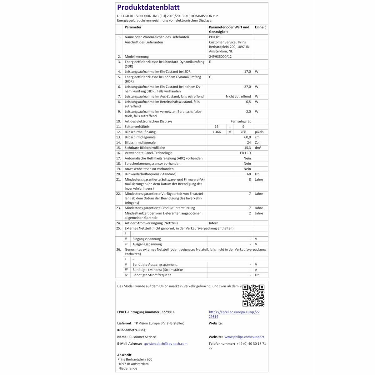 The Philips 24PHS6000 Smart TV is a compact television ideal for small spaces thanks to its 24-inch flat screen with HD 1366 x 768 resolution, offering clear and sharp image quality for everyday viewing. Equipped with its own operating system, Titan OS, this Smart TV provides direct access to apps and digital services, as well as Internet connectivity via its built-in WiFi technology. Its wide digital tuning capability supports DVB-C, DVB-S, DVB-S2, DVB-T, DVB-T2, and DVB-T2 HD formats, ensuring compatibility with most terrestrial, cable, and satellite digital TV broadcasters and platforms in Europe. Sound quality is supported by an estimated total power of 6 watts RMS, sufficient for a standard home environment without extra equipment. The black design offers a sober and elegant finish that fits various decor styles. With an E energy rating, it combines efficiency and functionality within its compact category, balancing consumption and smart features. The Philips 24PHS6000 is a practical choice for those seeking an affordable, versatile Smart TV compatible with multiple digital broadcast systems in a small format, suitable for bedrooms, kitchens, or secondary rooms.