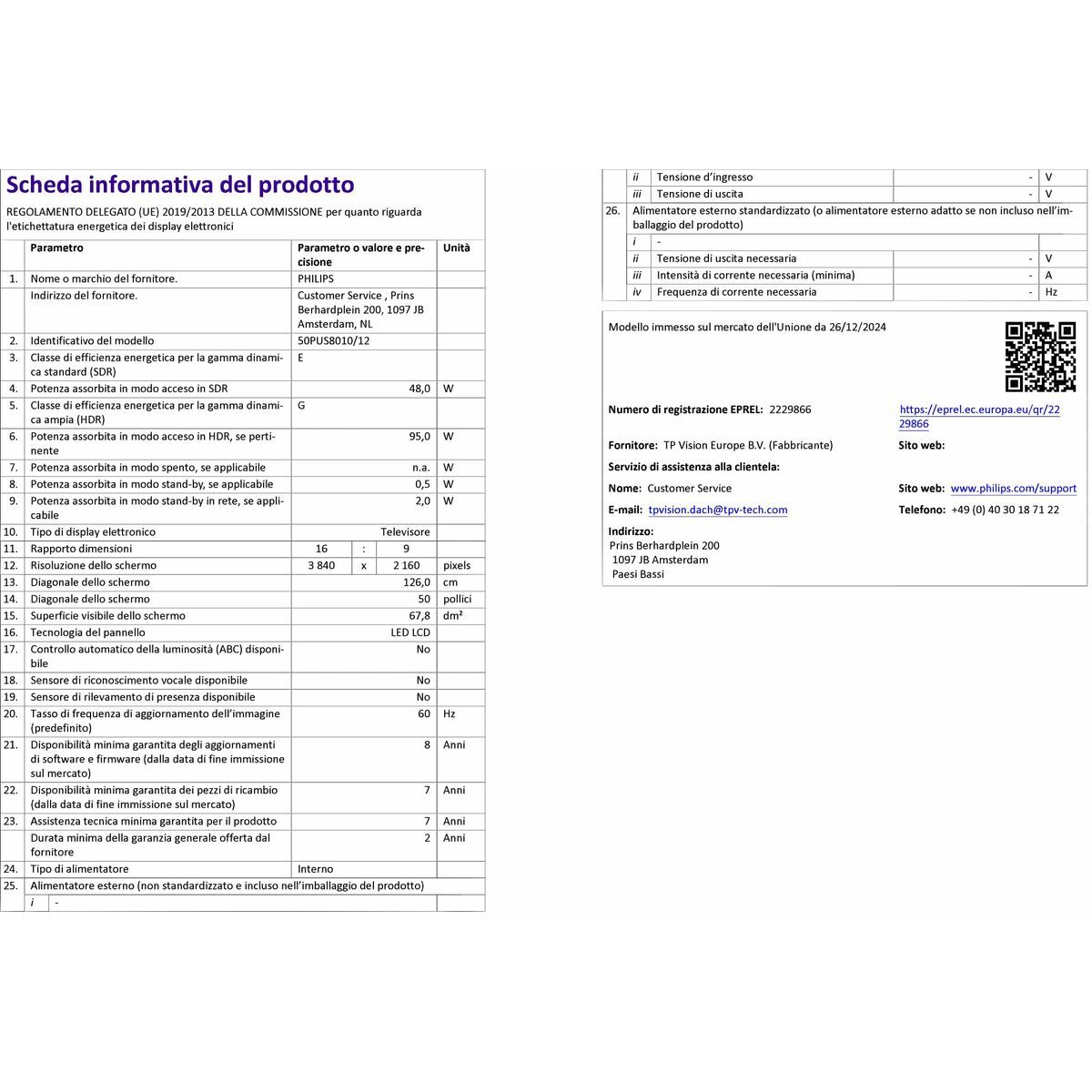 The Philips 50PUS8010 Smart TV is a smart television designed to deliver an advanced visual and audio experience in a size suitable for medium to large spaces, featuring a 50-inch flat screen and a native 4K Ultra HD resolution of 3840 x 2160 pixels that provides detailed, sharp images with high definition, ideal for enjoying high-quality content from digital platforms. Its Titan OS operating system ensures smooth and intuitive navigation through apps and streaming services, facilitating access to a wide variety of internet-connected content via its built-in WiFi connectivity. Additionally, the model includes an estimated audio power of 20W RMS, offering clear sound with sufficient volume for a standard-sized room, enhancing the multimedia experience without the need for external speakers. The TV supports multiple digital signal formats, including DVB-C, DVB-S, DVB-S2, DVB-T, DVB-T2, and DVB-T2 HD, allowing broad compatibility with various types of digital broadcasts, whether terrestrial, cable, or satellite. In terms of design, it features a black finish that adds sobriety and discretion, easily blending into different home environments. This model also stands out for its energy efficiency rated in category E, implying balanced consumption for its size and technical capabilities, and comes equipped with the included accessories necessary for immediate installation and use. It also has an ECO function that helps optimize energy consumption based on usage and environmental conditions. In short, the Philips 50PUS8010 is a versatile and complete option for users seeking a large-format smart TV with updated connectivity, high-resolution image quality, and an energy-friendly setup, suitable for a satisfactory and functional home audiovisual experience.