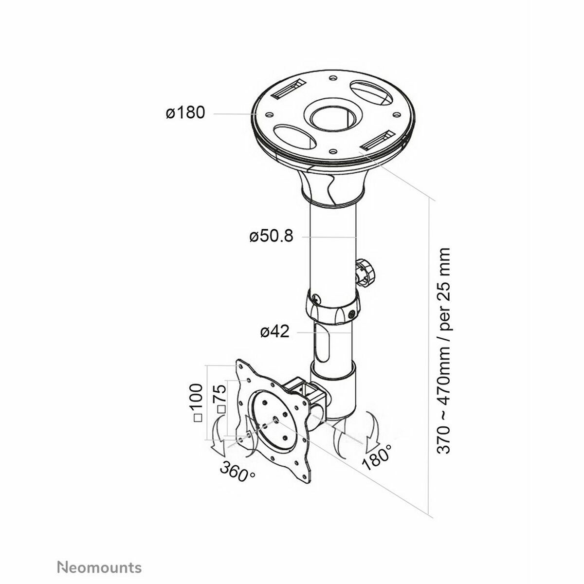 The Neomounts FPMA-C025SILVER is a ceiling TV mount designed for LCD, LED, or TFT monitors and screens ranging from 10 to 30 inches (25.4 to 76.2 cm), offering a versatile and compact solution for audiovisual installations in both home and professional environments. Made in silver, this mount allows secure installation using the universal VESA 75×75 mm to 100×100 mm pattern, ensuring compatibility with most standard screens on the market. Its adjustable height range, from 37 to 47 cm, enables a customized setup that fits various spaces and viewing preferences. Additionally, the FPMA-C025SILVER provides a wide range of movement, including a 360º swivel for full screen rotation, an adjustable tilt from 0 to 180º to position the optimal viewing angle, and the ability to raise or lower the screen to enhance viewing comfort and avoid glare or awkward angles. Its maximum load capacity is 12 kg, suitable for small to medium monitors and TVs, maintaining stability and safety at all times. This ceiling mount is especially ideal for spaces where surface area needs to be freed up, such as meeting rooms, offices, or compact rooms, offering an elegant and functional solution to place screens without compromising aesthetics or accessibility. Thanks to its robust and adjustable design, the Neomounts FPMA-C025SILVER ensures easy and reliable installation, providing a comfortable and professional audiovisual experience. Overall, it is a practical and complete option for those seeking a versatile and sturdy ceiling mount for screens between 10 and 30 inches.