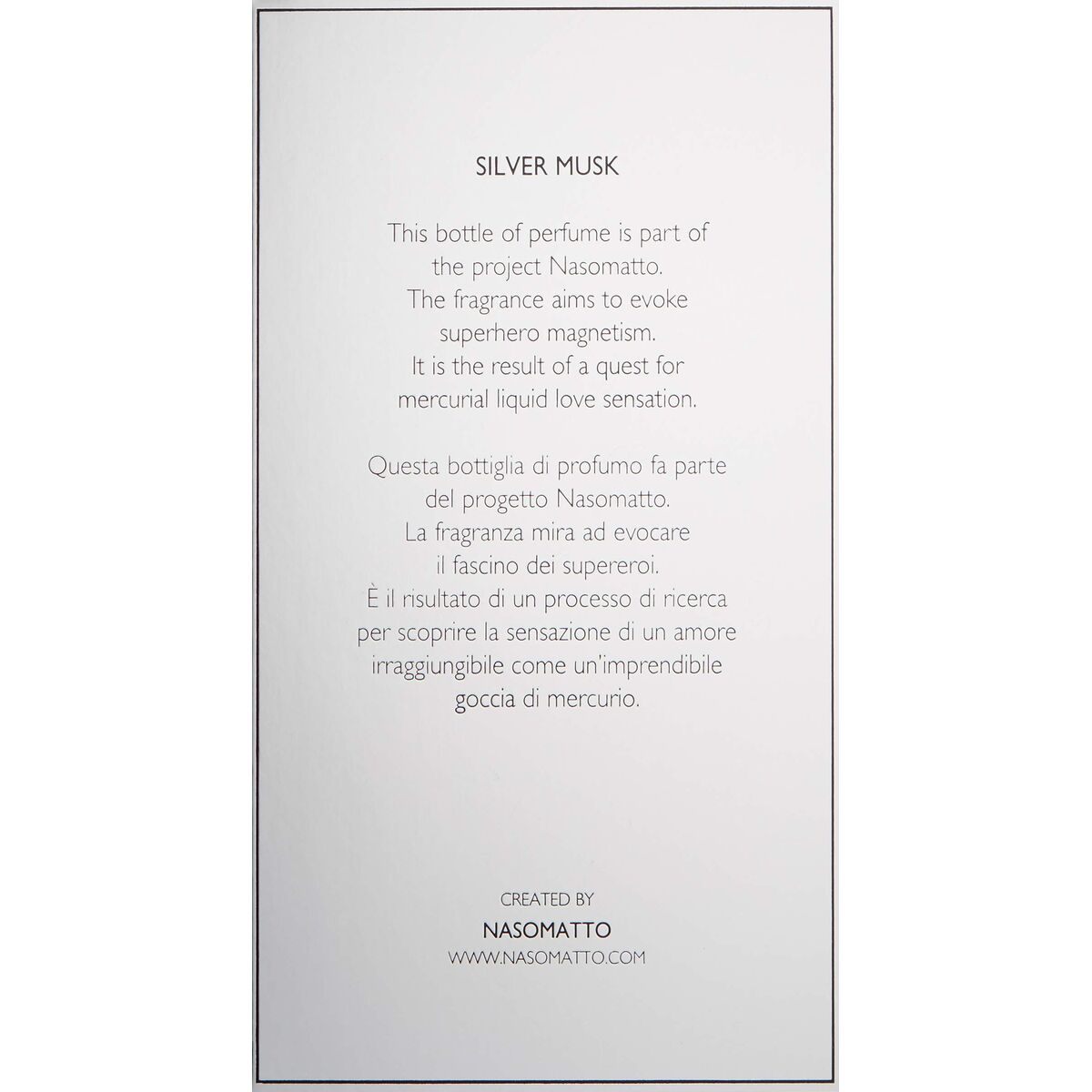 Let the 100% original Unisex Perfume Nasomatto SILVER MUSK 30 ml surprise you and boost your femininity using this exclusive women’s perfume with a unique, personal scent. Discover the 100% original Nasomatto products!