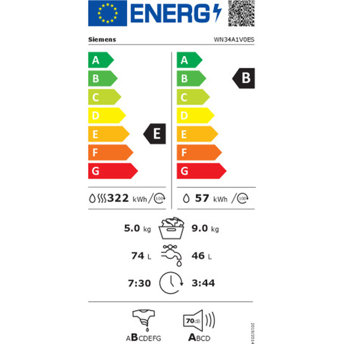 The Siemens WN34A1V0ES washer-dryer is an appliance designed to provide a complete solution for washing and drying clothes, ideal for both standalone spaces and under-counter installation. It offers location versatility thanks to its compact 60 cm width and white finish. This model features a 9 kg washing capacity and a 5 kg drying capacity, allowing efficient handling of large loads to suit family needs. It is equipped with a maximum spin speed of 1400 rpm, which helps speed up drying and significantly reduces residual moisture in clothes, easing ironing and handling. Regarding energy efficiency, it offers two relevant ratings: class B for washing and class E for combined washing and drying, reflecting a balance between performance and responsible consumption. This appliance includes an integrated display and safety features such as child lock, ensuring easy and safe operation for all users. The Siemens WN34A1V0ES offers a wide range of specialized wash programs, including options for delicate fabrics like silk and wool, cold wash cycles, sportswear, and hygienic treatments aimed at allergy control, as well as quick and specific programs for different fabrics and needs, including rinse, spin, and drain. For drying, it provides a delicate care program that protects sensitive fibers, minimizing wear and extending garment life. Overall, this model represents a practical and flexible choice for those needing a combined washer and dryer with suitable features for everyday use, easily integrating into various home environments.